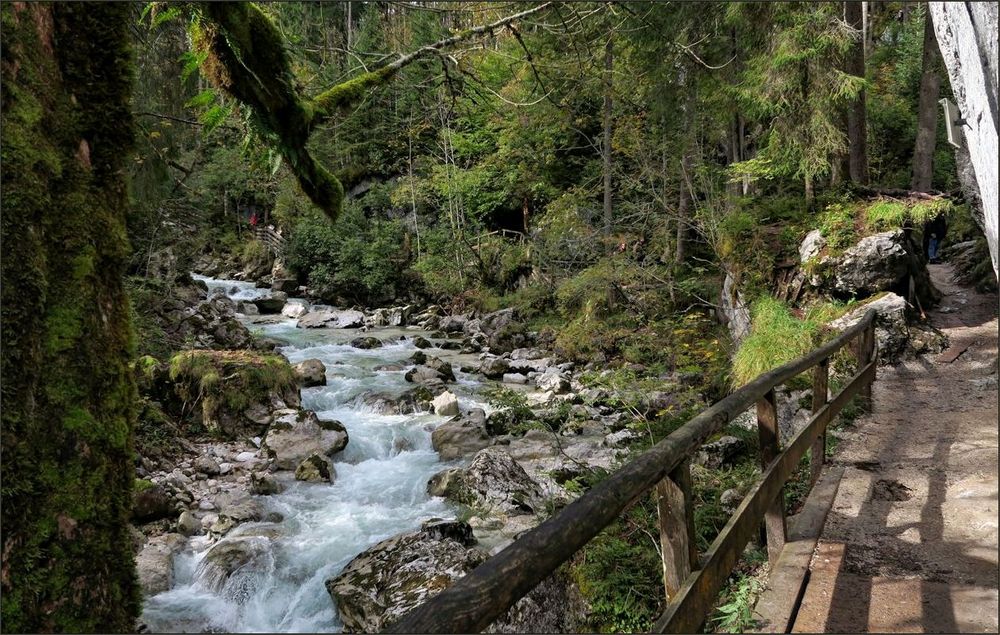 Immer der ramsau ache entlang, laufen wir über holzstege, ducken uns unter hervorragenden felsen oder heruntergefallenen bäumen.